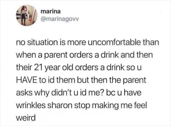 No… no I think the waitress ID-ing me on my 40th-something birthday while I was out with my parents who are visibly in their 70’s was more uncomfortable. It was a weird moment for everyone involved. (Drinking age is *16* here for the record.)