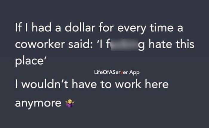 if one person got one penny for each time a service worker said they hated their job that one person would have enough money t cover the earth in a layer thick enough to swallow the moon before supper.