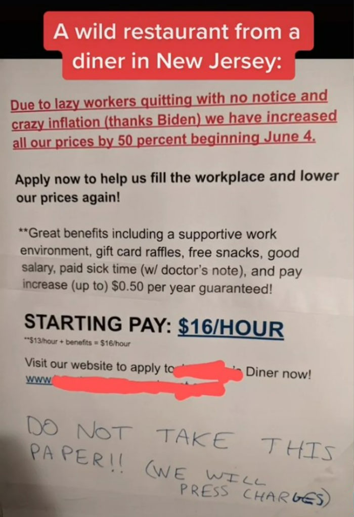 One restaurant in New Jersey recently came under fire after they posted a sign explaining their increased prices and advertising job openings. The sign was shared by the Restaurant Opportunities Centers United on TikTok, where the video has received 1.4 million views in the last month and sparked many conversations about the working conditions in the restaurant industry. Below, you can read the sign yourself, as well as some responses from viewers and an interview with a representative from ROC United, and see some of the other flyers business owners have angrily shared. Then if you’re interested in reading another Bored Panda article featuring employees speaking out about their treatment, check out this piece next. Image credits: roc_unitedA diner in New Jersey recently came under fire after a passive aggressive sign they posted went viral on TikTok