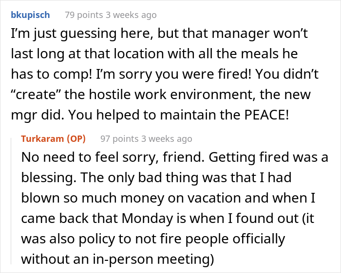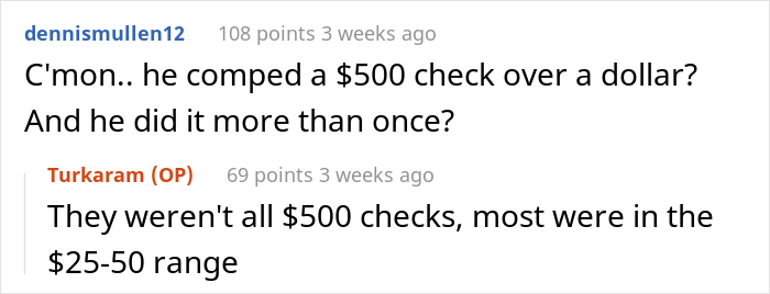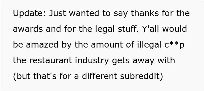 We managed to get in touch with Turkaram and he was kind enough to expand his story for us a little bit. “By and large, my coworkers were awesome,” the Redditor told Bored Panda. “They were probably the only reason I worked there for as long as I did (about 3 years) because there was a real comradery among the core group of servers/bartenders. Management was pretty solid most of the time before our assistant manager left (she was awesome) and was replaced by Brad, but before he arrived, I never felt like anyone was being targeted or punished for nonsense.”