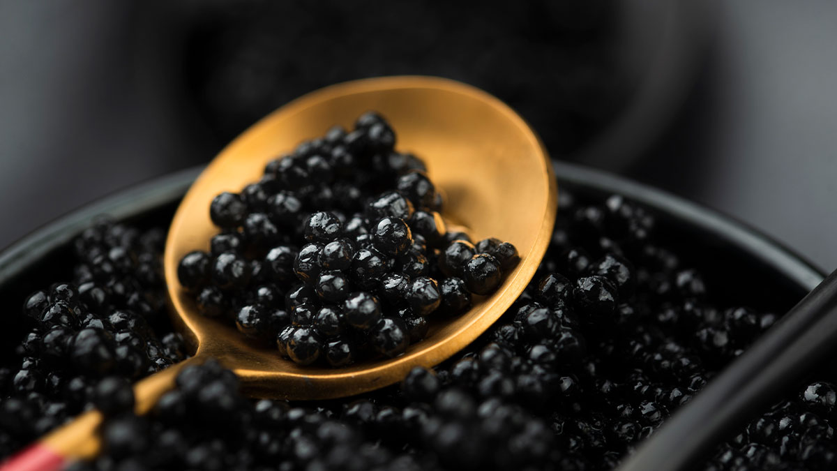 Close-up of black caviar on a gold spoon, illustrating luxury and rich people behavior in high-end dining venues. Ordering $150 caviar to-go for their cat.