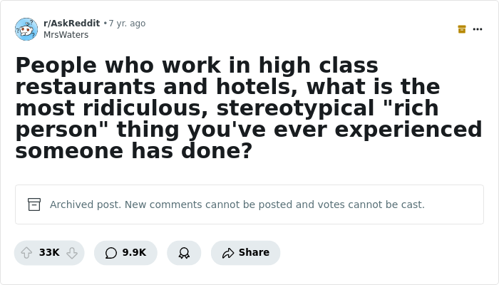 So when someone online asked, “People who work in high-class restaurants and hotels, what’s the most ridiculous, stereotypical ‘rich person’ thing you’ve ever seen?”, the internet did not disappoint. Employees from around the world came forward to spill the beans, and what they shared ranges from hilariously weird to downright jaw-dropping. Scroll down for a hilarious peek into the world of the ultra-wealthy, where money talks, but sometimes it says the weirdest things. And remember, behind every ridiculous story is a hospitality worker trying very hard not to laugh (or cry).