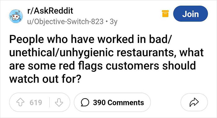 "Having restaurant workers discuss the warning signs can help customers pay attention to issues they otherwise would ignore." In the OP's view, the discussion got a lot of attention due to morbid curiosity. "People like sharing disgusting stories and experiences." The internet user was glad that the thread blew up because it really helped them be more careful about where they eat.