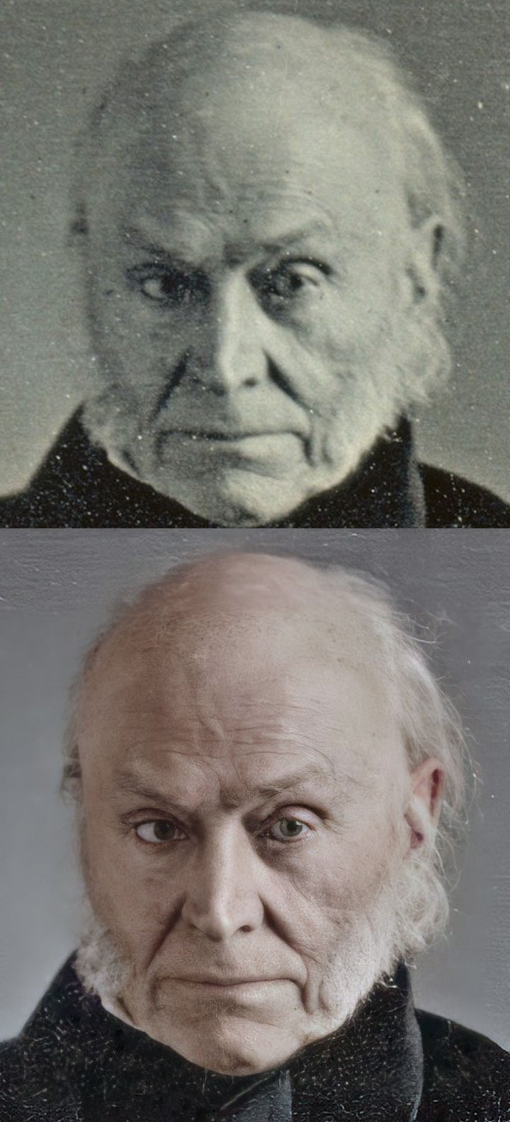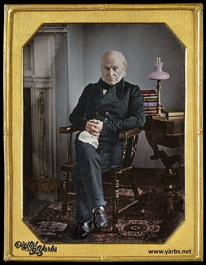 There were two of these photographs taken of Adams in 1843 by Philip Haas. One was lost to history until 2017. The one pictured here is the one that was rediscovered in 2017. Both images are here colorized and enhanced for clarity. https://yarbs.net/all-things-john-quincy-adams/john-quincy-adams-the-philip-haas-daguerreotypes-enhanced.html