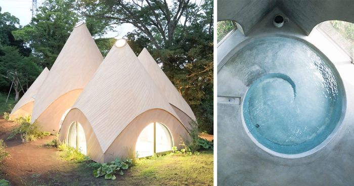 Issei Suma is known for his intriguing buildings, but this structure shaped like 5 tents are really eye catching, due to the harmonious flow and the design that perfectly combined minimalism with an ecological style. The building features a spiral-shaped indoor pool and a common kitchen for both ladies. This 100 square m complex is called “Jikka” and is located in the Japanese mountains Shizuoka Prefecture.