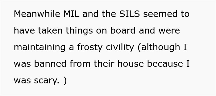 What is more, throughout this story, OP’s husband seemed reluctant to confront the family, or to even believe the things they were up to. At first, he was convinced nothing was really wrong and MIL did not really hate OP. But this was the moment the hubby stepped up and once the unsatisfied SIL approached him, she shushed her. You can imagine, in context, it was the middle finger equivalent. They had won.