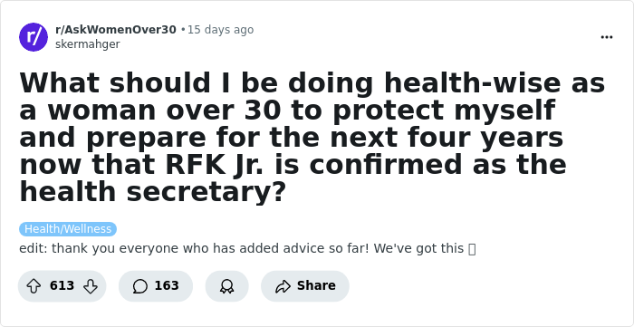 Led by uncertainty over the future, women took to the internet to share their worries or advice on how best to prepare for the upcoming several years. One internet user addressed the members of the ‘Ask Women Over 30’ community, asking what health-measures she should take to protect herself and prepare for the next four years now that RFK Jr. is confirmed as the health secretary, and quite a few women shared valuable insight, which you can find on the list below.
