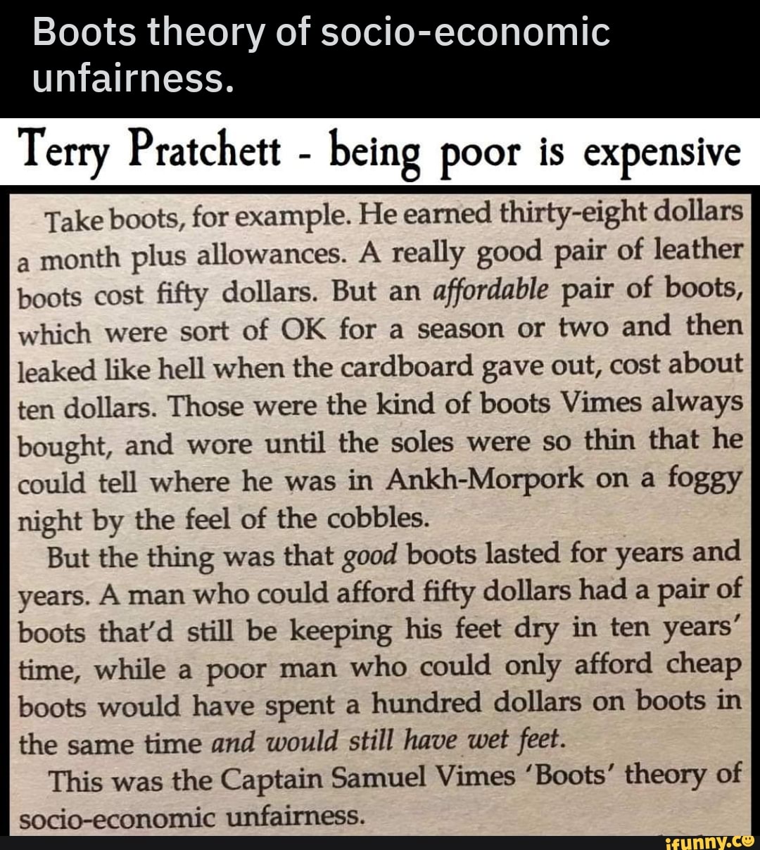 "The reason that the rich were so rich, Vimes reasoned, was because they managed to spend less money. Take boots, for example. He earned thirty-eight dollars a month plus allowances. A really good pair of leather boots cost fifty dollars. But an affordable pair of boots, which were sort of OK for a season or two and then leaked like hell when the cardboard gave out, cost about ten dollars. Those were the kind of boots Vimes always bought, and wore until the soles were so thin that he could tell where he was in Ankh-Morpork on a foggy night by the feel of the cobbles. But the thing was that good boots lasted for years and years. A man who could afford fifty dollars had a pair of boots that'd still be keeping his feet dry in ten years' time, while the poor man who could only afford cheap boots would have spent a hundred dollars on boots in the same time and would still have wet feet."