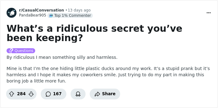 When someone online asked, “What’s a ridiculous secret you’ve been keeping?” the answers came pouring in, from unexpected obsessions with Jurassic Park to undying love for potato chips. Keep scrolling to get your daily dose of ridiculously relatable and oddly sweet stories.