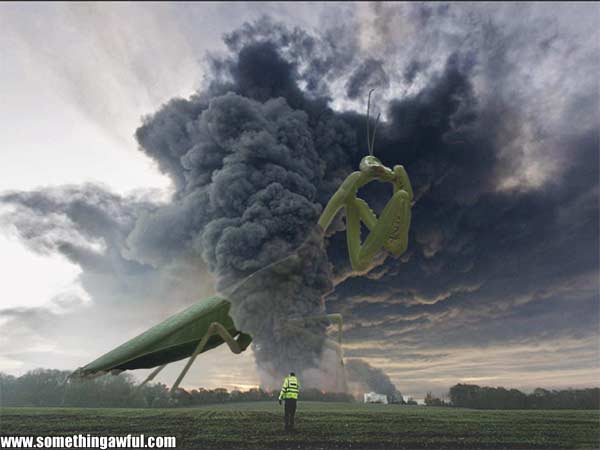 Make a super obvious or ridiculous photoshop about monster sightings in various places like this terrible giant praying mantis.