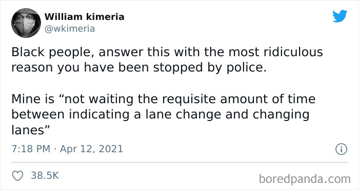 William’s thread soon went viral, amassing 39.2k likes from people sharing all kinds of heartbreaking stories of being unrightfully disturbed by the police. “Mine is 'not waiting the requisite amount of time between indicating a lane change and changing lanes,'” said the thread’s author, and it became obvious this is just the tip of a giant racist iceberg that rots society from the inside out.