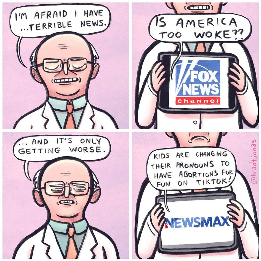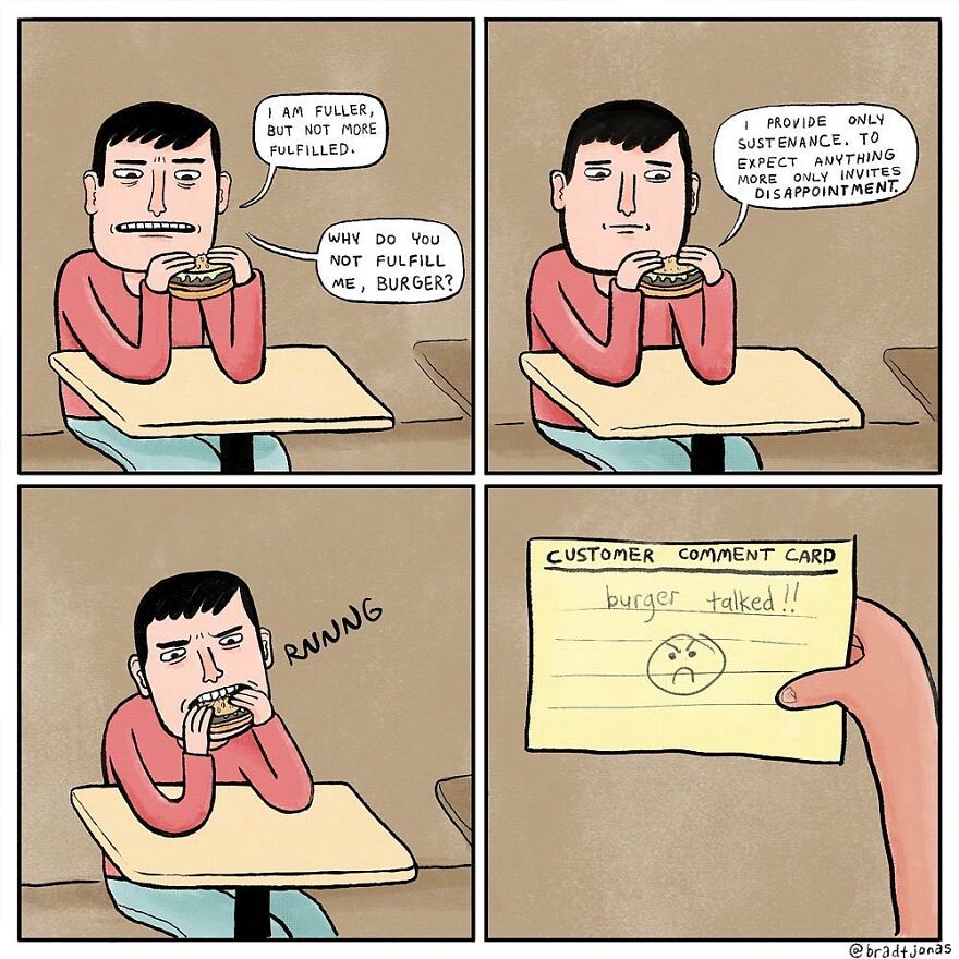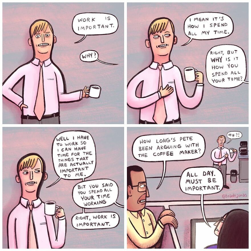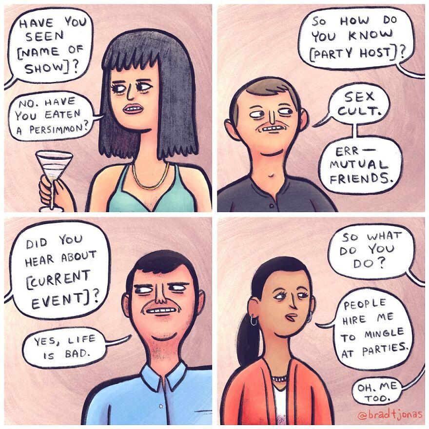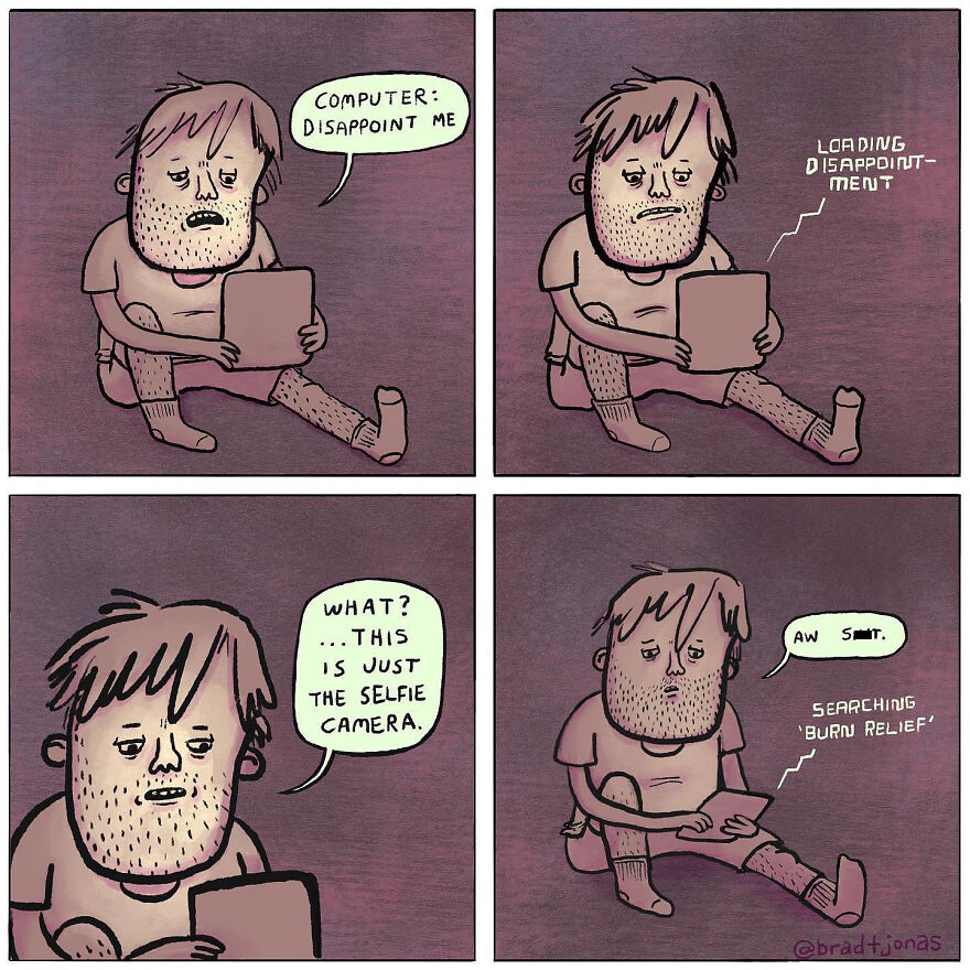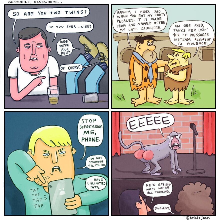 Life sometimes doesn't make any sense. We have so many ways to talk to people, yet we feel disconnected; there are a lot of single people, yet no one to date. These and many other examples are perfectly illustrated by the artist Brad, who also exaggerates and puts a funny twist to it.