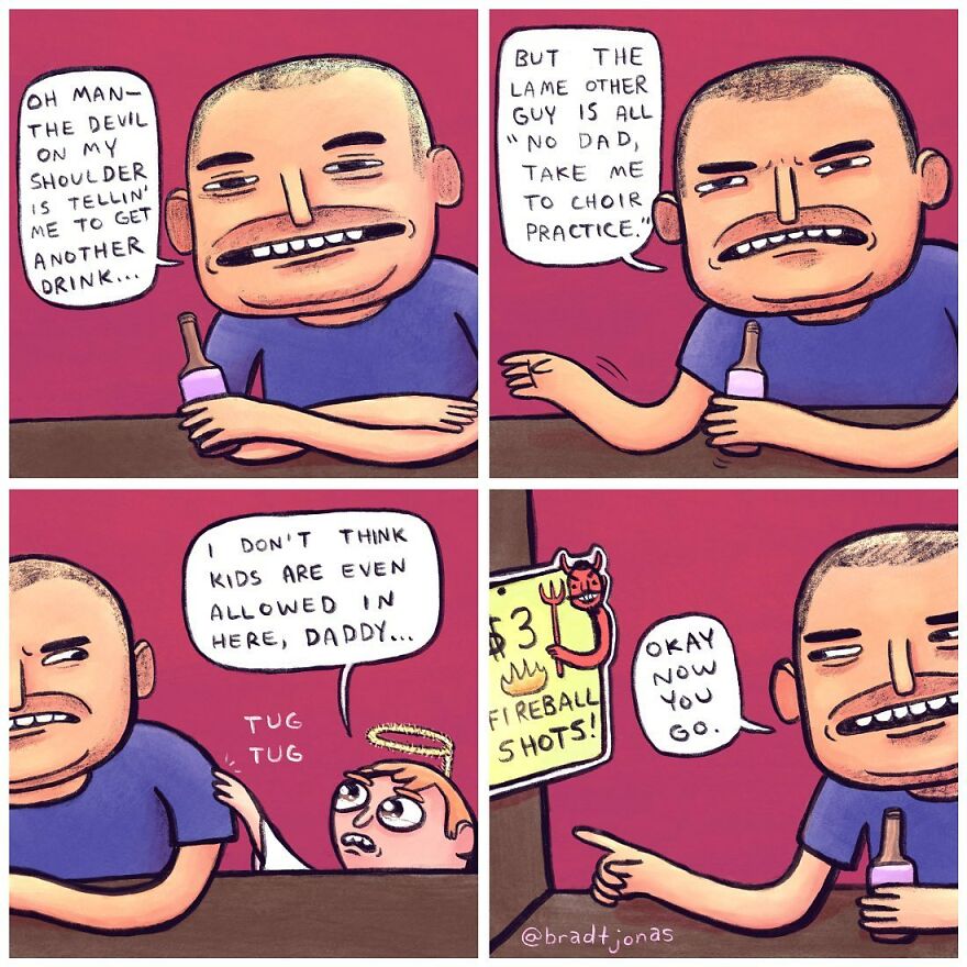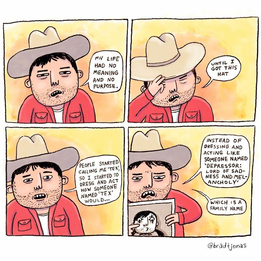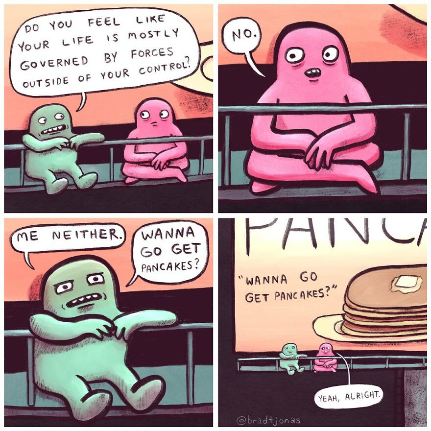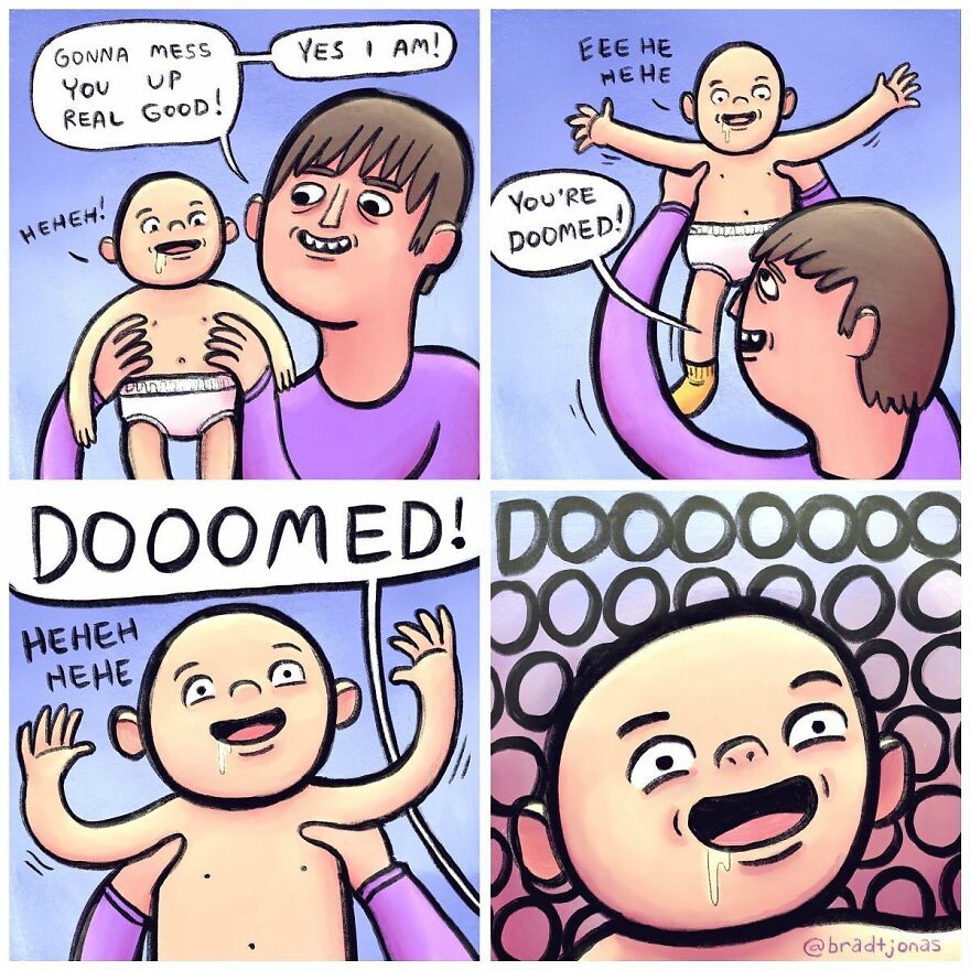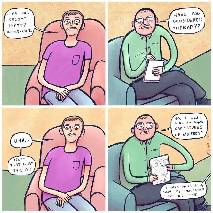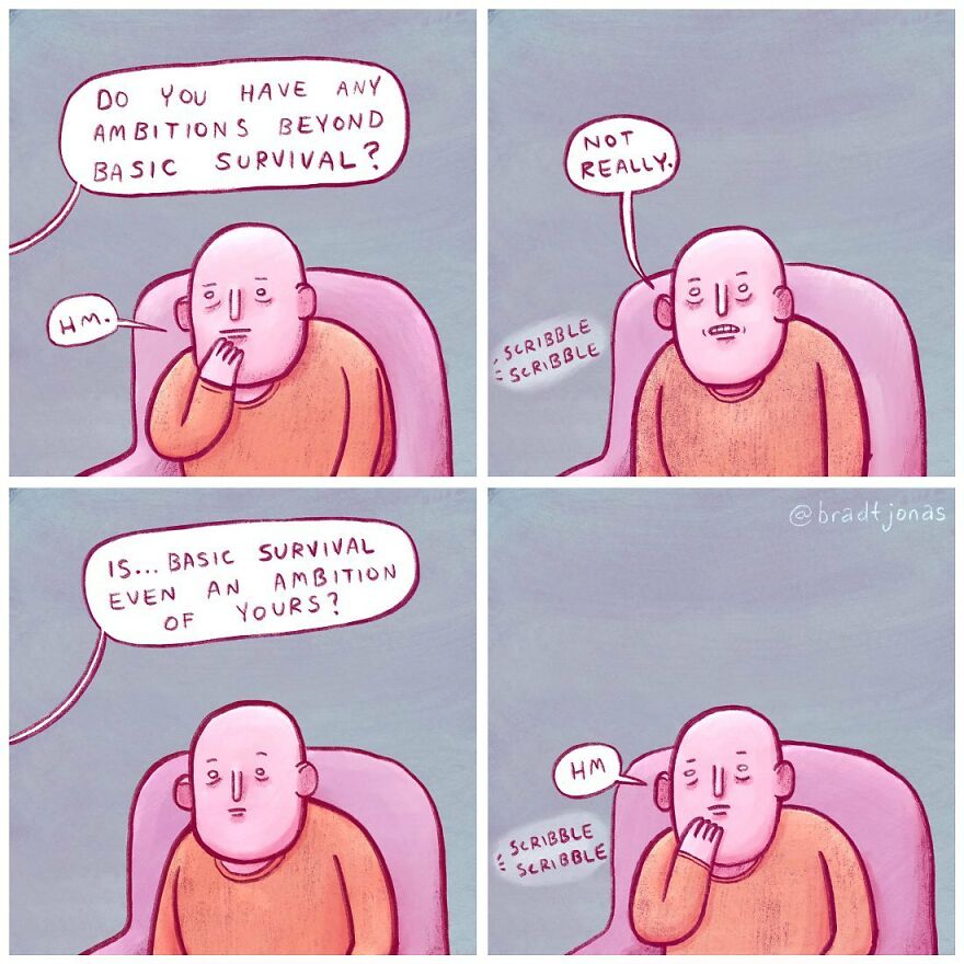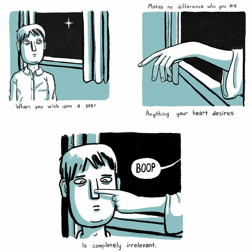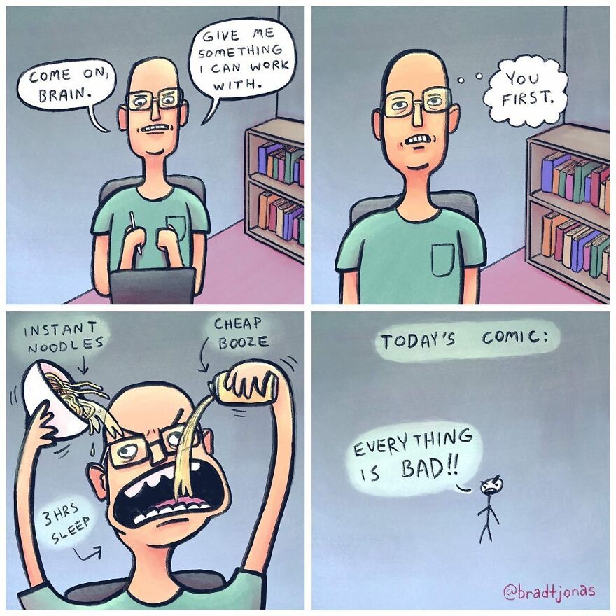 Brad, also known as 'bradtjonas' on Instagram, is a 35-year-old illustrator from the United States. We reached out to Brad, and he shared about how he began to create comics. "After college and just before moving to NY I started a website to post comics called soyourlifeismeaningless.com. It was supposed to read like a self-help book title along the lines of 'So You'd Like to Quit Smoking' or something like that, but I don't know if anyone ever really got that. It eventually became a DAILY comic, more with a focus on quantity over quality, frankly, hoping to at least instill a daily work habit in myself."
