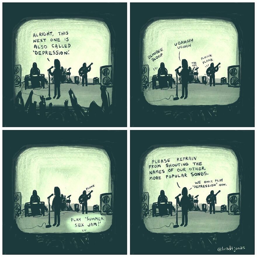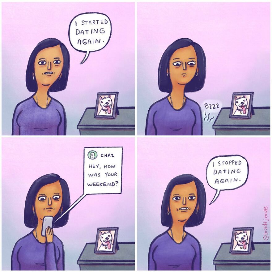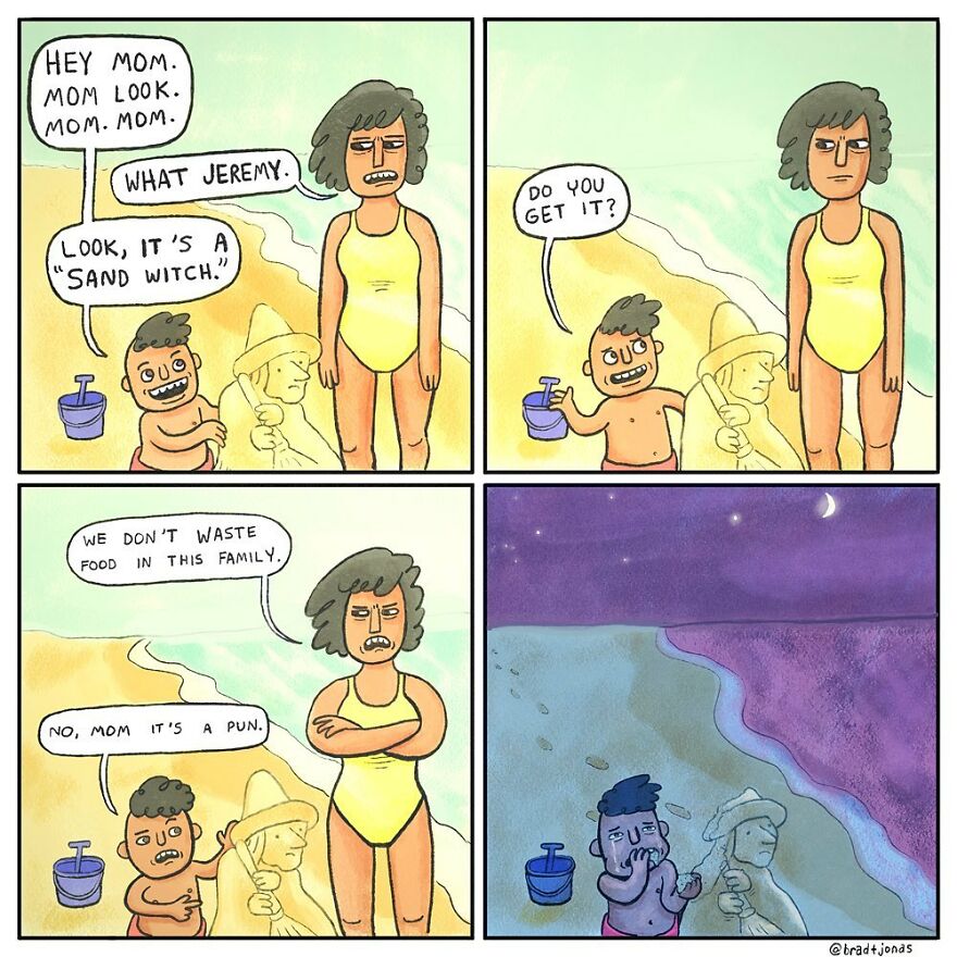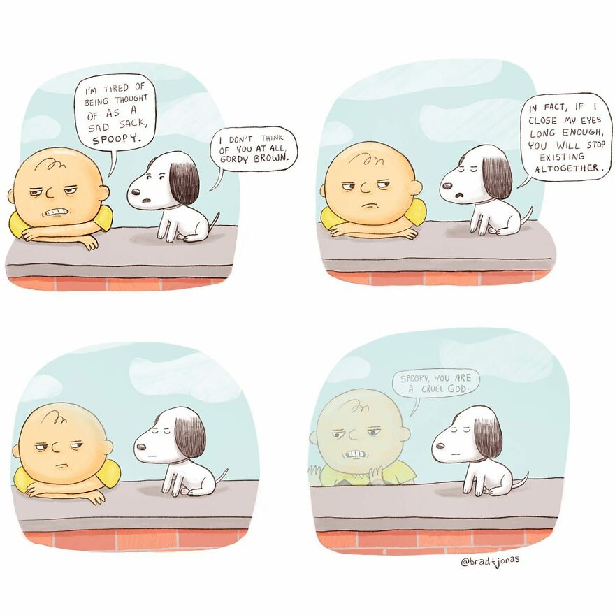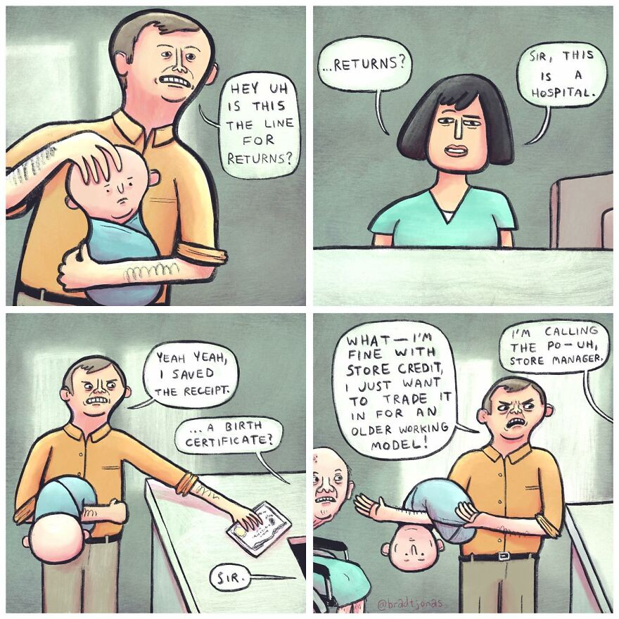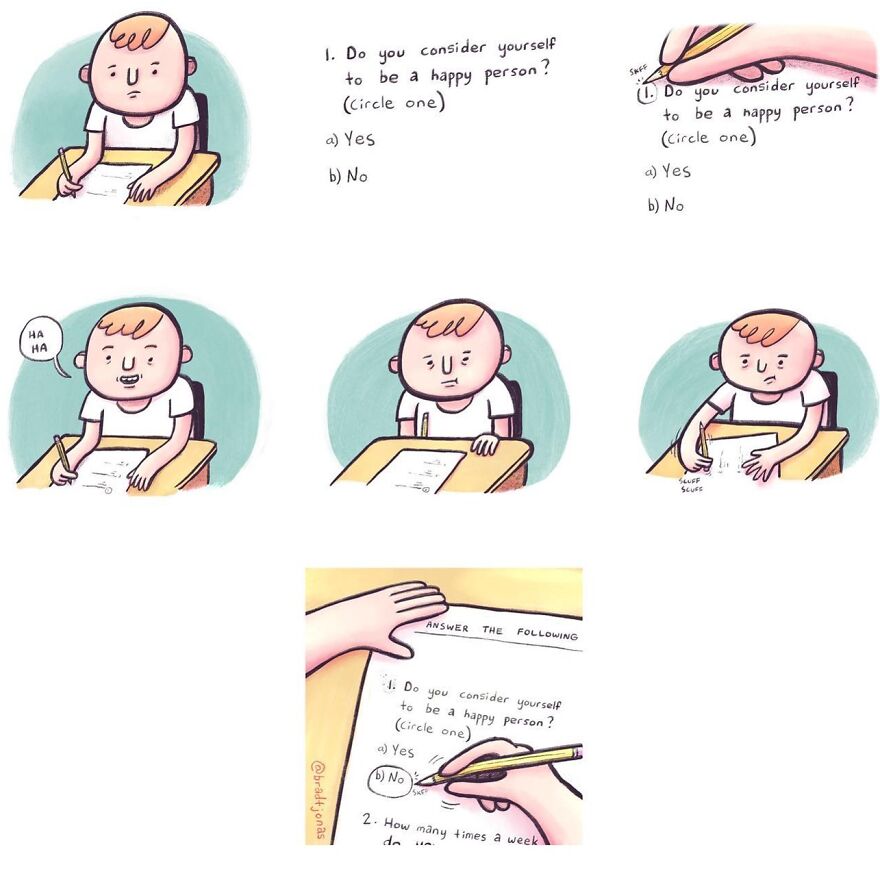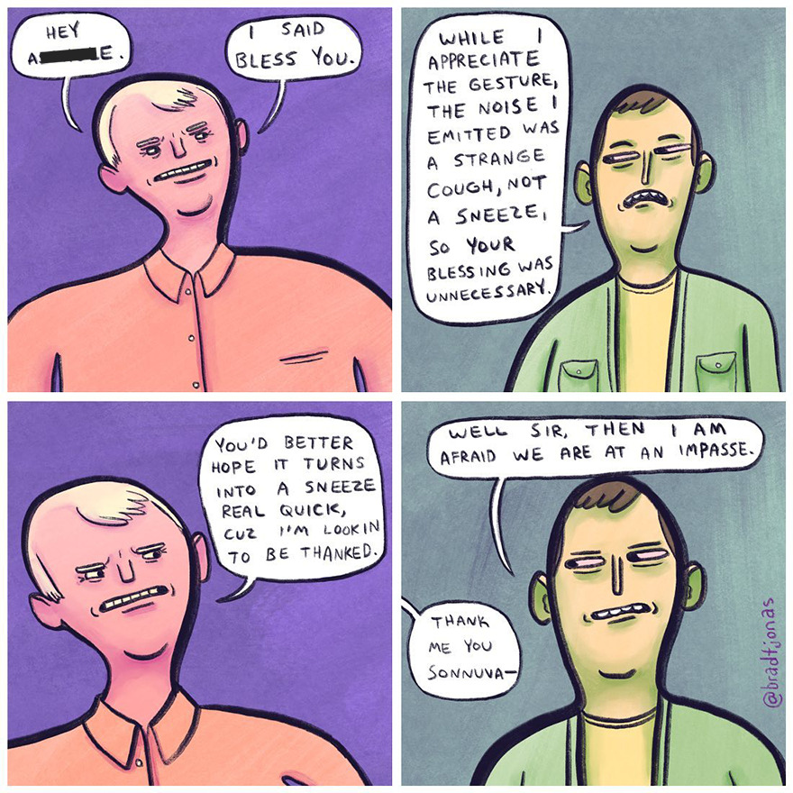Brad, also known as 'bradtjonas' on Instagram, is a 35-year-old illustrator from the United States. We reached out to Brad, and he shared about how he began to create comics. "After college and just before moving to NY I started a website to post comics called soyourlifeismeaningless.com. It was supposed to read like a self-help book title along the lines of 'So You'd Like to Quit Smoking' or something like that, but I don't know if anyone ever really got that. It eventually became a DAILY comic, more with a focus on quantity over quality, frankly, hoping to at least instill a daily work habit in myself."