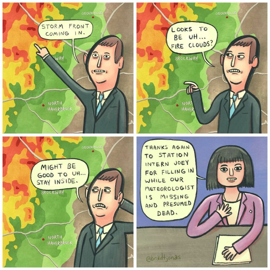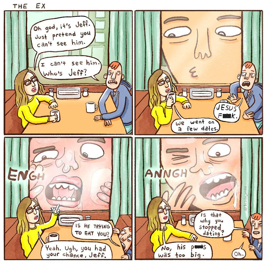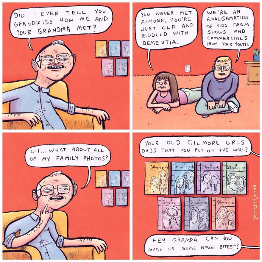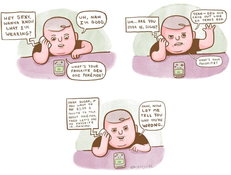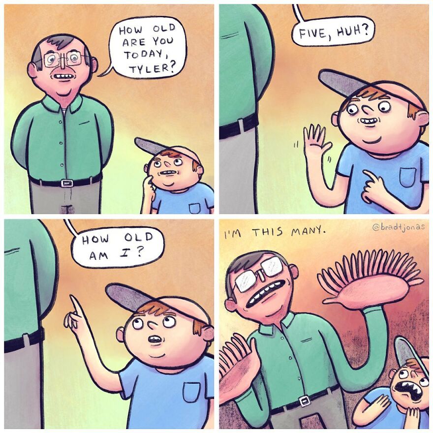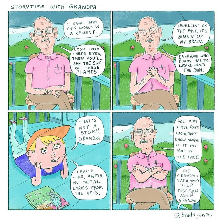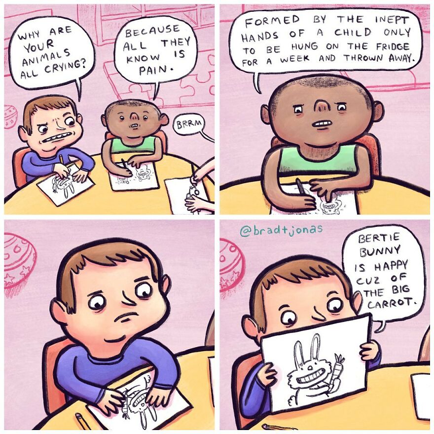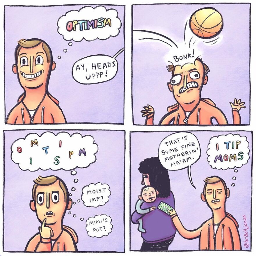Brad, also known as 'bradtjonas' on Instagram, is a 35-year-old illustrator from the United States. We reached out to Brad, and he shared about how he began to create comics. "After college and just before moving to NY I started a website to post comics called soyourlifeismeaningless.com. It was supposed to read like a self-help book title along the lines of 'So You'd Like to Quit Smoking' or something like that, but I don't know if anyone ever really got that. It eventually became a DAILY comic, more with a focus on quantity over quality, frankly, hoping to at least instill a daily work habit in myself."