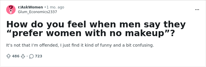 Honestly the men commenting here in askwomen explaining why they prefer women with no makeup, giving absolutely weird takes like "they're less likely to lie about themselves" just prove my point of view. Red flag. Not the type of man I'd want to be around.
