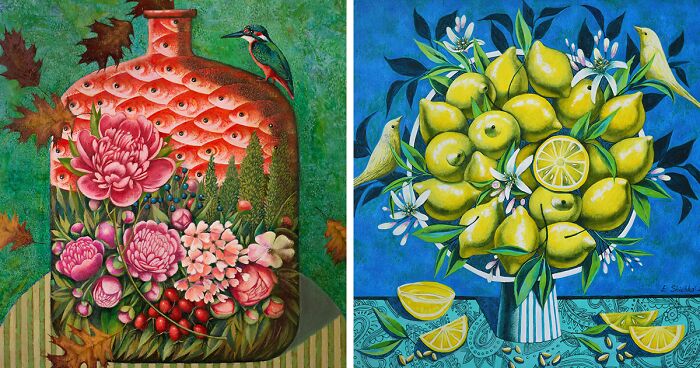 I would call my creative style fantasy realism. It includes elements of surrealism, decorative art, abstraction, and realism. Objects from real life interest me as elements from which you can create your own unique space with a special unique history. I really love bright open, cheerful colors, and decorative textures.
