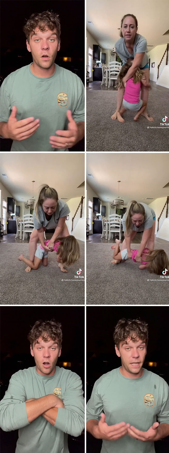 The question I get asked the most is what can I do to protect my children from not being kidnapped, or if they're being taken, what can they do? The next video is a technique you can teach your children and it's very effective. In the video she's clinging onto a leg with her arms and then clinging onto a leg on with her feet. What that does, it makes it very, very hard to move. And she's right, they could lose balance and fall and then you can run away. If not, it still looks very awkward. People are gonna start asking questions.