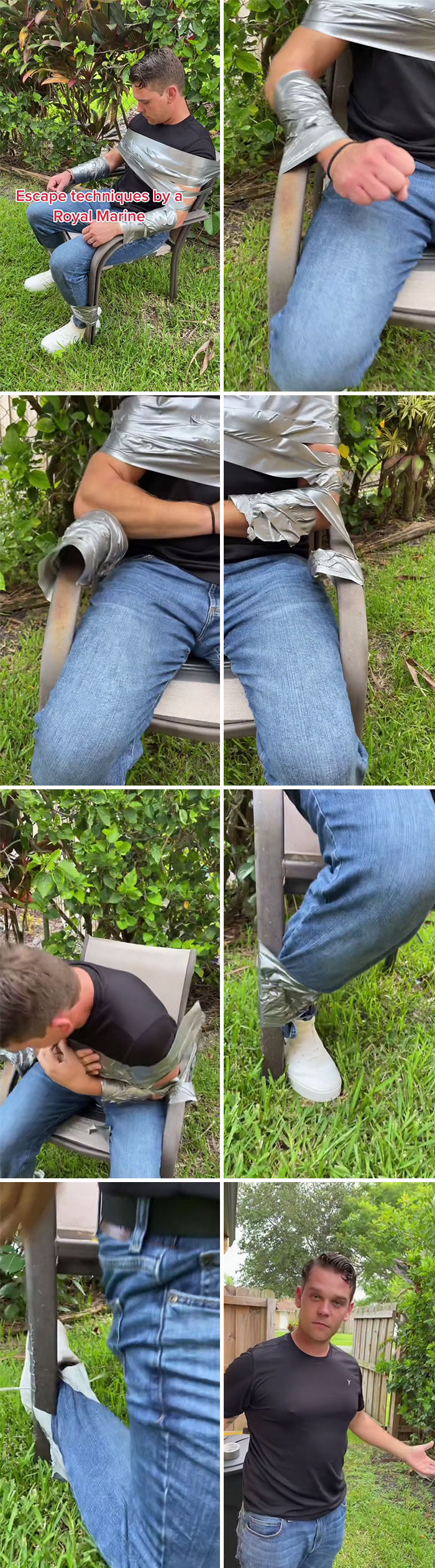 Here's a tip you should've learned in school. If you ever find yourself kidnapped and duct taped, here's how to get out. Shift your arm from left to right creating a small tear in order to break the duct tape. You're going to do the same on your other hand. Now for the duct tape on your chest, you're going to put both hands on your chest and move forward. Like a brace position. After that you move on to the legs, create a small little tear and then just push through. And that's how I get out.