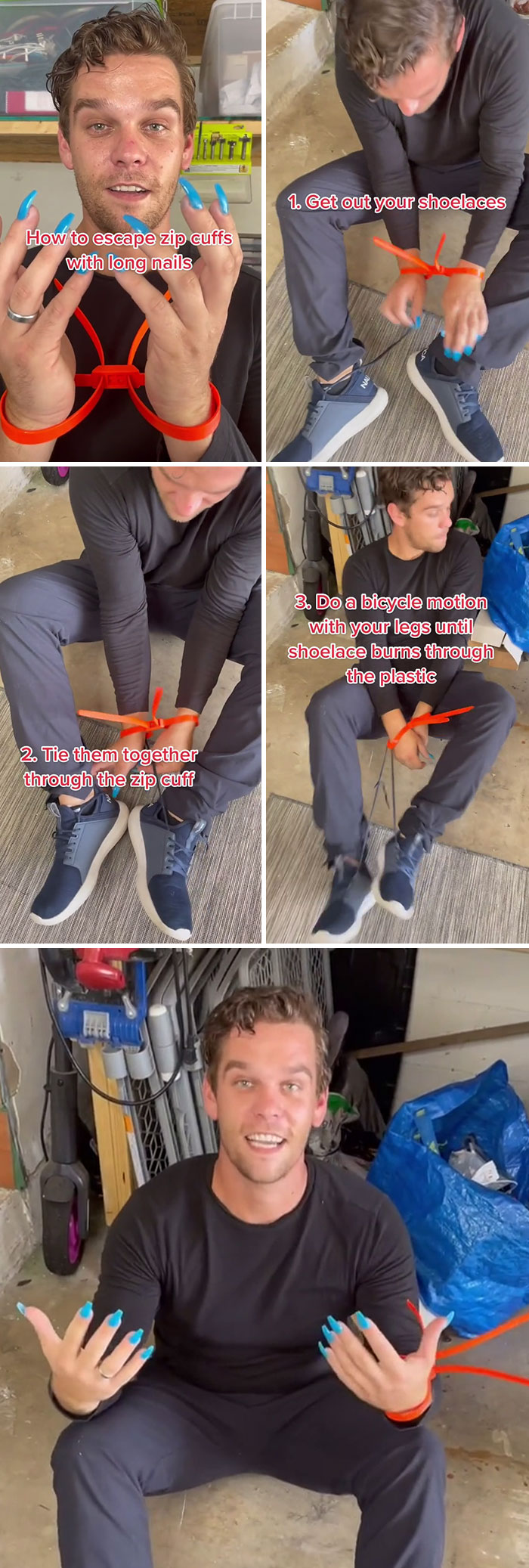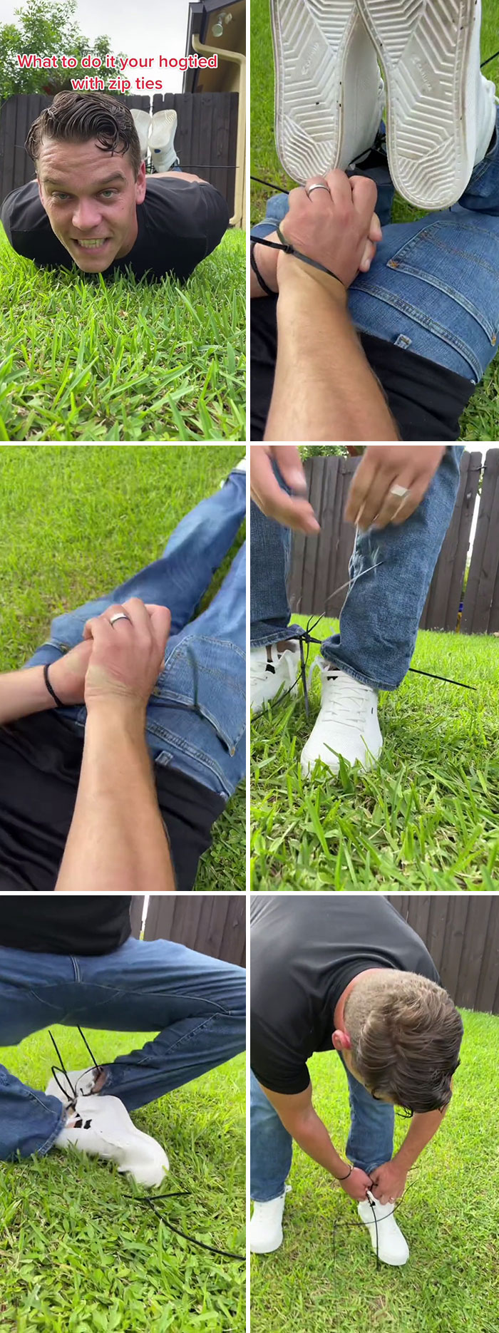 What do you do if you're hogtied with zip ties? You're going to move everything up and then over. Now you still got these. Now with these, you need to tighten them as much.