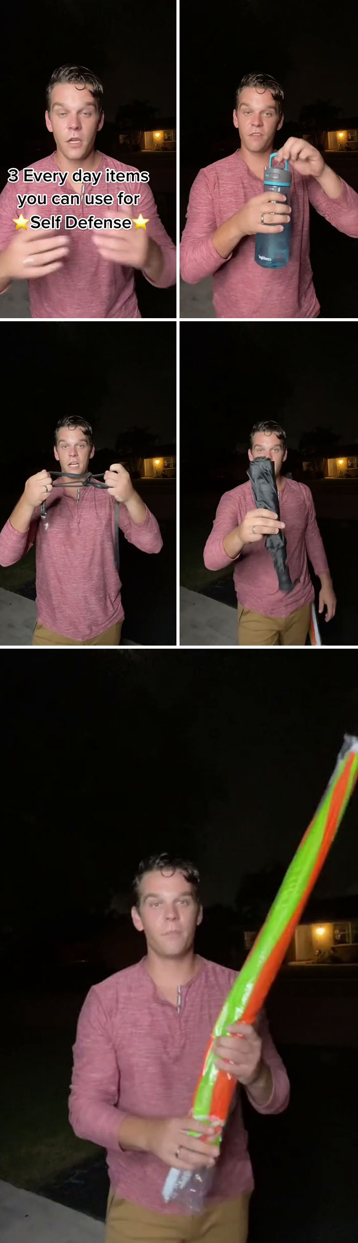 Number one, a water bottle. Even better if it has a handle. It's even better if it's made of steel if you knock someone out, take a little sip.
