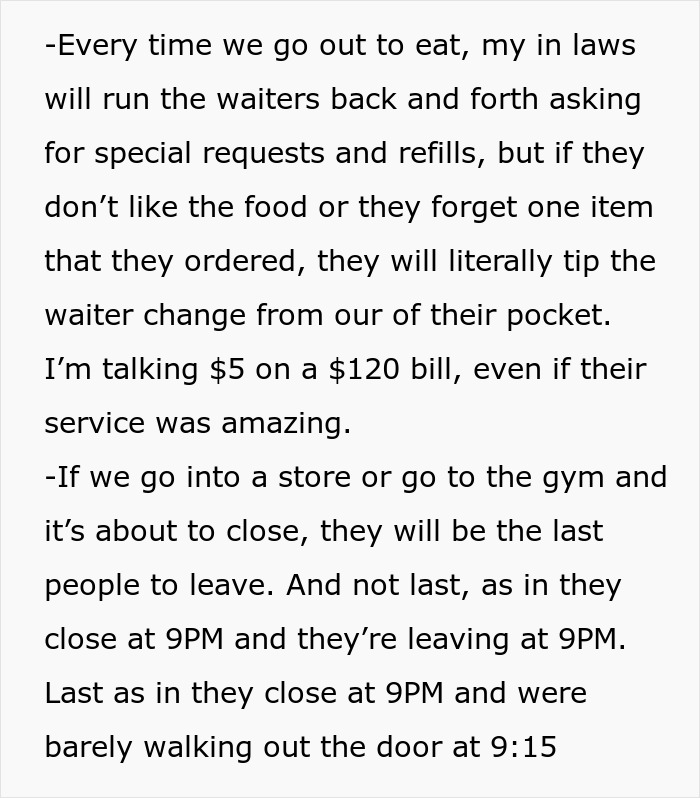For example, at restaurants, the OP’s in-laws would literally drive the staff into a frenzy with various petty orders and quibbles, while leaving meager tips, literally taking coins out of their pockets. The original poster believed that her husband was not like that, but reality soon shattered this belief…