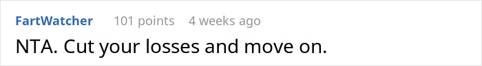 People in the comments massively supported the original poster, both in the situation as a whole and regarding her decision to part ways with this man. According to commenters, every person needs support in such moments – and feeling that your spouse has morally distanced himself from your problems sometimes looks like a real betrayal. “Your in-laws are insensitive, agreed, but the main culprit in this scenario is your husband,” someone reasonably wrote.