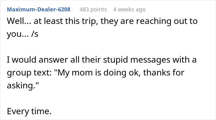 The OP’s husband stated that he had told his relatives about his MIL’s disease, and they allegedly expressed sympathy, but the author of the post herself did not feel any sympathy from them at all. Moreover, when she returned to Texas – her work required her presence in the office, no one from the extended family even mentioned the topic of her mom’s health in any communication.