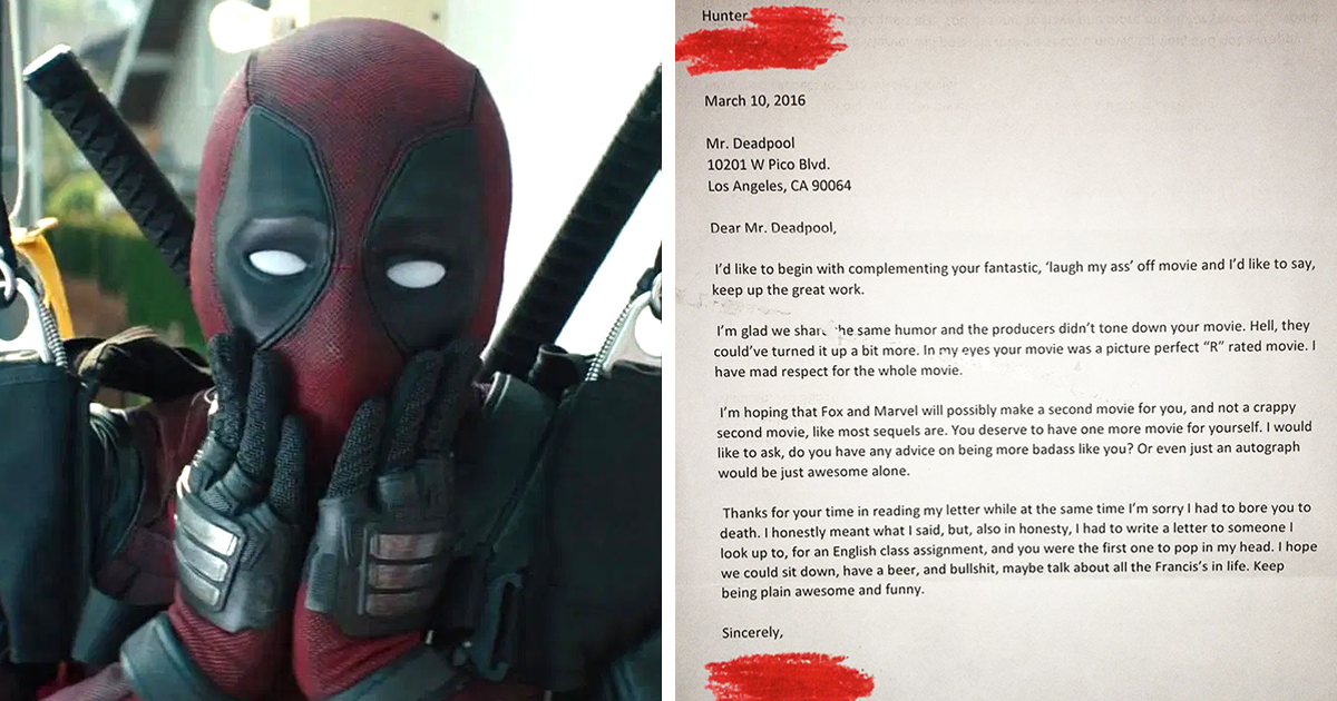 Well, after the launch of Deadpool, Ryan Reynolds received a letter from a fan who apparently was given an English class assignment to write a letter to someone they looked up to. Unbeknownst to the teacher, this kid decided to write Deadpool himself. And Ryan Reynolds replied.