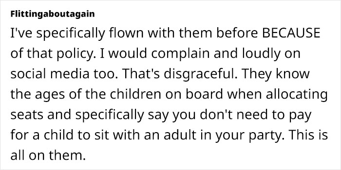 Load More Replies...They might have a policy on seating kids with adults but when most other people have *paid* for seat selection so that they can sit with their friends and families, it's unreasonable of you and the airline to expect them to give up their seat. It's a catch 22 - unless and until the airlines are forced to offer free seat selection for minors at time of booking parents are going to have to cough up. As long as parents cough up for seats together they wont make the change. I'm sure shareholders are happy with the status quo.