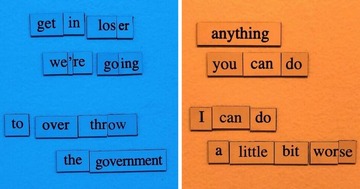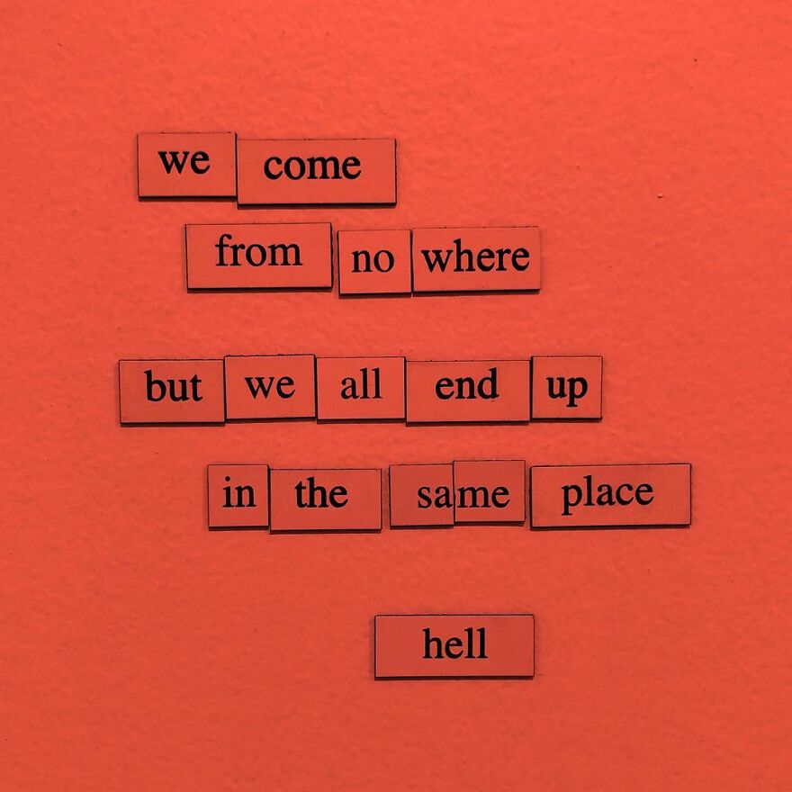 "Back in 2013, my college had an event where we were given little sets of word magnets as a gift on our way out. The magnets were all happy little words about the event ("fun," "dance," etc.), so my friends and I naturally thought it would be more fun to try and write something horribly depressing with them instead. So, the first poem was born. The next year, I spotted some magnets on a friend's refrigerator and decided to make another. And another, and another, and another — and from there it eventually spiraled into Depressing Fridge Poems."