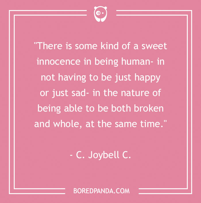 "There is some kind of a sweet innocence in being human- in not having to be just happy or just sad- in the nature of being able to be both broken and whole, at the same time." - C. Joybell C.