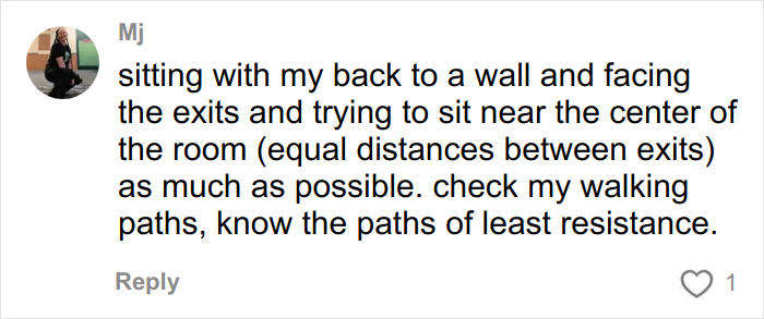 I always sit near the exit in places like the cinema. It makes me feel safer because I know I can get out ASAP if necessary.
