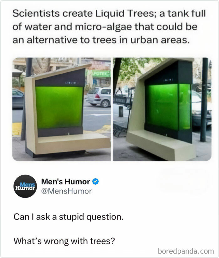 Green liquid tank known as Liquid Trees by scientists as alternative to urban trees, funny meme about trees.