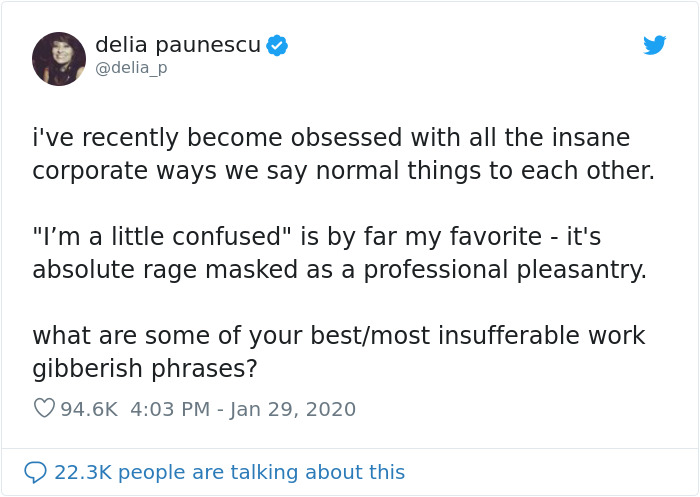 Recently, writer, producer, and social media consultant Delia Paunescu asked Twitter to list the best/most insufferable work gibberish, and holy coffee-machine-small-talk, did everyone deliver! Scroll down to check them out and upvote your faves!