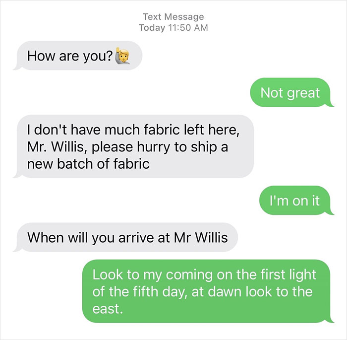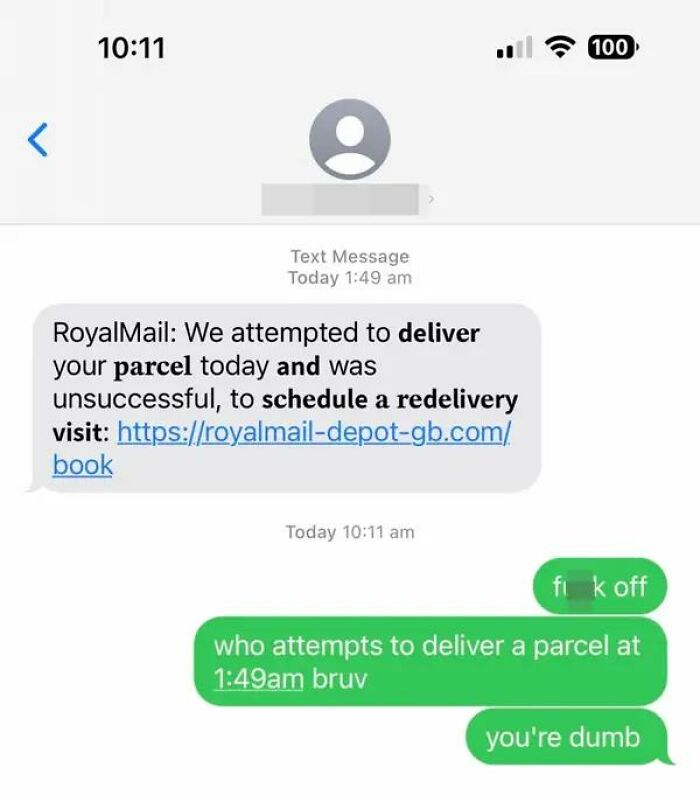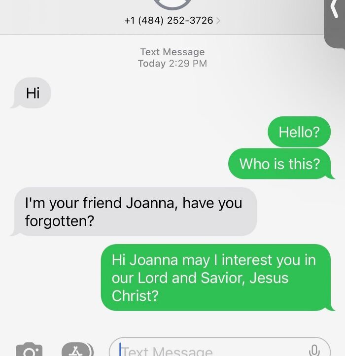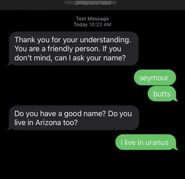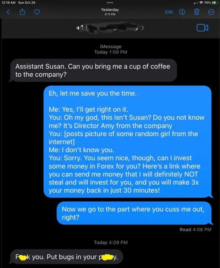 Load More Replies...I don't get scam texts but I do get scam calls. They're usually about health insurance (Medicare) or auto insurance for some reason. I like to mess with the scammers by talking in a mixture of German, mock German and Yiddish. After a few moments they just hang up.