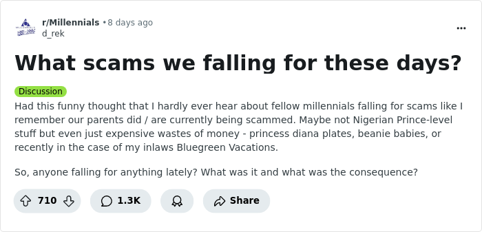 A lot of these comments aren't scams, just trends people don't like (labubu, funko pops, etc). ACTUAL scams millennials are falling for include: