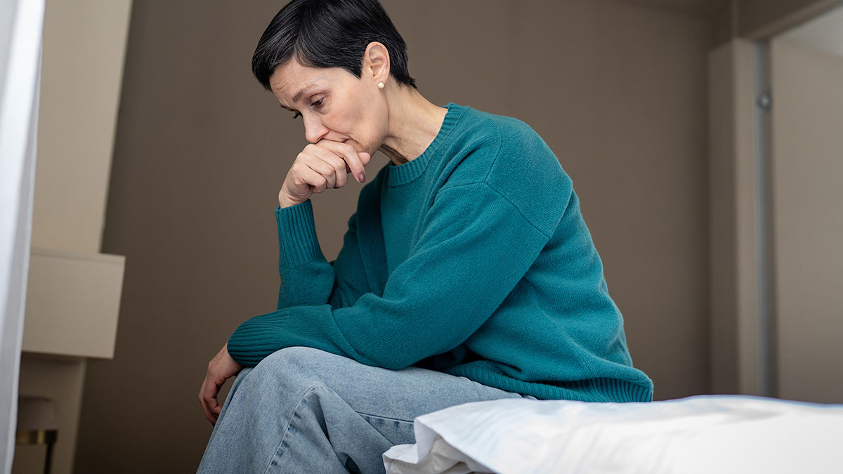 Woman in teal sweater sitting on bed, deep in thought, reflecting on limits and autistic kids affecting motherhood decisions