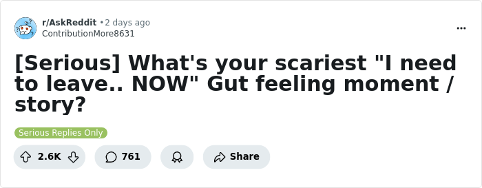 To learn more about this intriguing mental mechanism, Reddit user ContributionMore8631 asked everyone else on the platform to describe the scariest moments when their gut feeling told them to immediately leave the place they were at.