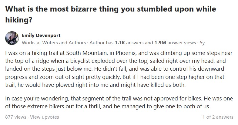 I was on a hiking trail at South Mountain, in Phoenix, and was climbing up some steps near the top of a ridge when a bicyclist exploded over the top, sailed right over my head, and landed on the steps just below me. He didn’t fall, and was able to control his downward progress and zoom out of sight pretty quickly. But if I had been one step higher on that trail, he would have plowed right into me and might have [unalived] us both.