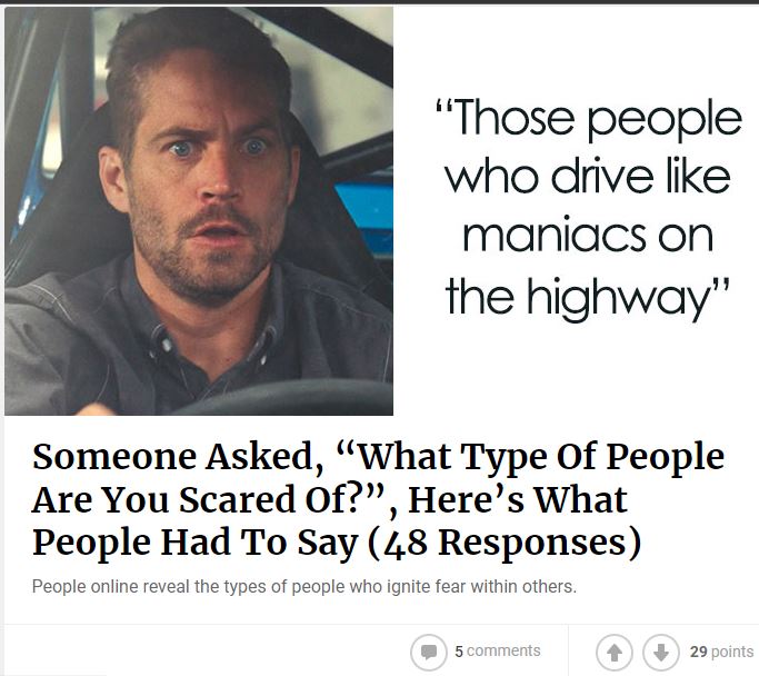 USING A PICTURE OF PAUL WALKER (or someone who is his doppelganger) who died from burns and trauma from a car accident next to a picture of "Those people who drive like maniacs on the highway." Seriously, WTF? dfg-645ee4...ddd3aa.jpg