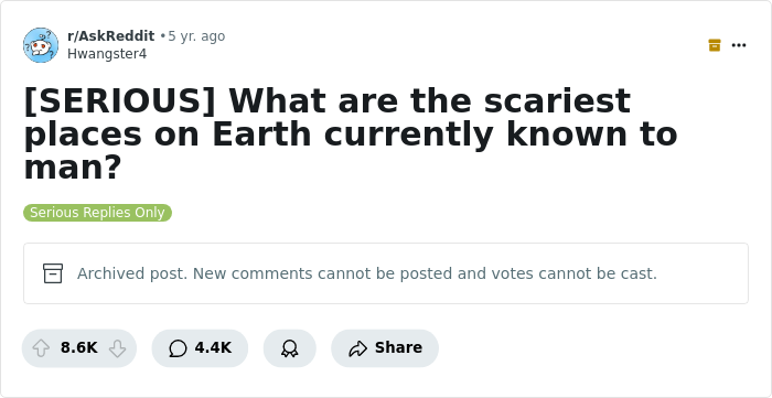 Curious about which places top people's anti-bucket lists, Reddit user Hwangster4 asked everyone on the platform to share the creepiest corners of the globe they'd never want to visit—at least not without an Iron Man suit and a battalion for backup.