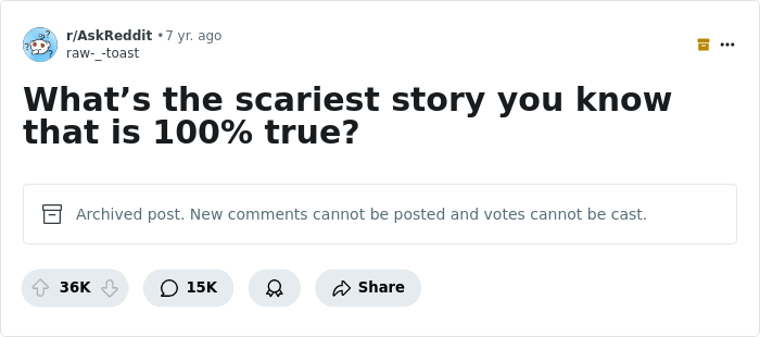 Load More Replies...Doubt anyone will read this. My mum's friends grandmother I think lived on her own and was an older woman so people didn't really take her seriously when she said things. Anyway so she said she kept hearing noises near her not sure where it was coming from, on multiple occasions. Turns out the noises were her next door neighbor who had some mental issues and found a way to come into her house from the attic. When the banging got louder one day, the old lady was scared and so locked all her doors (not sure exactly where the noise was coming from) which made everything a lot worse because he came in with an axe and ended up murdering her with it, and it was difficult for her to escape because she locked all the doors and windows.