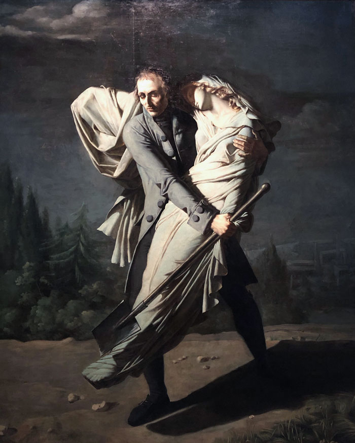 Pierre-Auguste Vafflard displayed this stunning picture of love and death at the Salon in 1804. Here, fatherly love is what prompts poet Edward Young to struggle yet continue to carry his deceased daughter's body in the cold moonlight. It is now known that this scene was based on a real-life conflict between beliefs involving Young's evacuation of his deceased daughter, who was eighteen at the time, to Lyon's Swiss cemetery after being turned away from the Catholic cemetery because she was a Protestant.