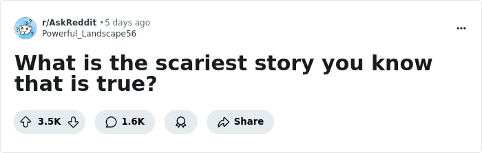 The scariest story I know would be the Villisca ax murders. Happened in Villisca, Iowa in 1912. A husband, wife, their 4 children, and 2 neighbor children came home from a church service, had cookies and milk, and went to bed. That night they were all m******d in their beds with an ax.