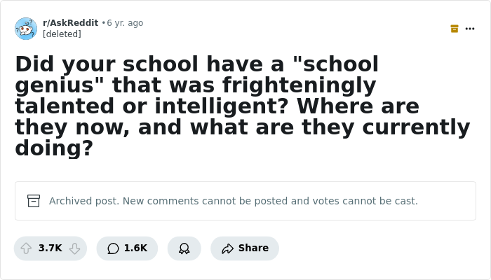 Our school genius wasn’t a genius at all. He would have been above average at a larger school, but the problem was this was a class of 80 in rural Missouri. He’s a fairly successful lawyer now. Most people from the class are on welfare or work labor jobs.