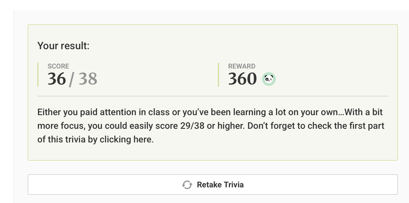 Load More Replies...I seriously thought I'd fail this because enough questions pertained to the US (which I've never studied) Italian history/Greek history/mythology (also never studied) or general geography (which I dropped as soon as I could because I detested it). Ah well, shows me where I need to branch out when I have the time. ☺️