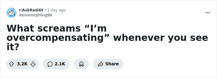 A few days ago, a post appeared in the AskReddit community, the author of which, the user u/Xenomorphling98, asked the question: "What screams 'I’m overcompensating' whenever you see it?" It must be said that the question was clearly relevant, so in two days, the resulting thread boasts more than 3.2K upvotes and over 2.1K various comments.