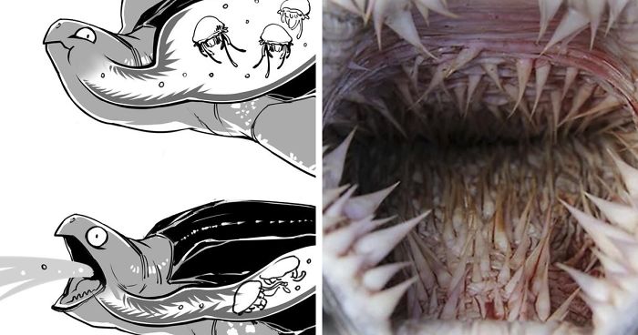 Artist and biologist Helen Kairo, also known as Anatomika Science, has created an informative and creative series of illustrations that show us why sea turtles look like something out of Aliens when they open their mouths.
