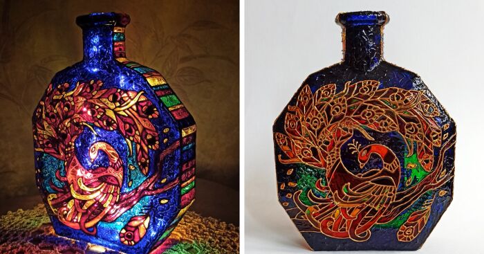 Once there was an old cognac bottle. It spent about 15 years under a solid layer of dust in our garage. But not long ago it received a second chance. I have been always passionate about colorful birds and when one of my friends said she wanted something special on a bottle, I knew what to do. Here is the result. The bottle can be both a shelf decoration and can be turned into a sort of lamp with the help of a light strand.